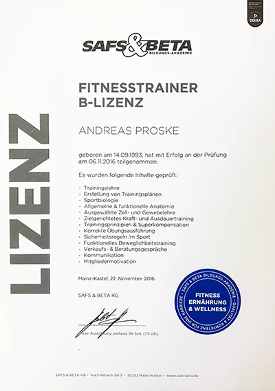 2,5 Jahre Ausbildung zum staatlich anerkannten Sport- und Gymnastiklehrer, lizenzierter Fitnesstrainer, zertifizierter Kettlebelltrainer.